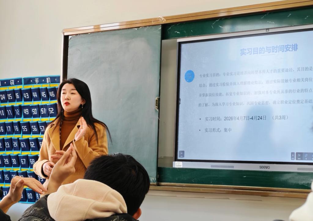 刘海鸥老师向同学们详细介绍了各实习单位的工作安排与工作要求。她主要从实习的时间安排、考核标准、请假流程和安全注意事项等方面进行了详细的讲解。