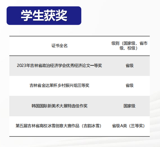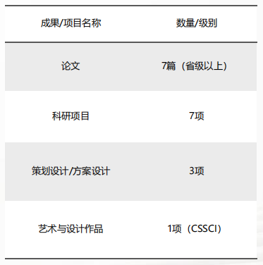 本领域自2023年开设以来共招收5名学生,师生经过1年努力, 获得了2023年吉林省政治经济学会优秀经济论文一等奖一项、公开发表CSSCI艺术与设计作品一项、发表省级论文7篇、科研项目立项7项、完成策划设计/方案设计项目3项。